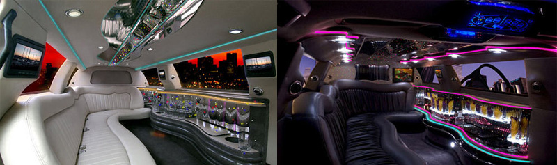 Amenities: TV/VCR, CD player, privacy window divider, custom lighting, moon-roof, and intercom. Also available, a complimentary "well" bar.