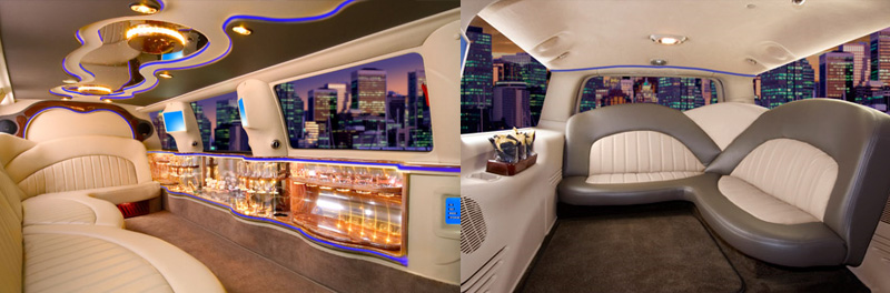 Amenities: TV/VCR, CD player, privacy window divider, custom lighting, moon-roof, and intercom. Also available, a complimentary wet "well" bar